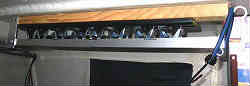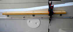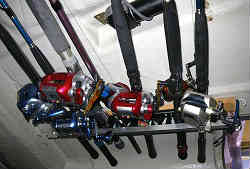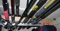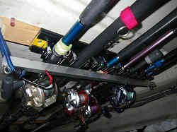 竿の穂先保管: 上記ロッド保管は常時使う電動リールの付いた物であるが、竿先(バッドを除く)の方はルアーロッドを保管する6連(細い)の物を購入して取り付けた。 | ![]() |