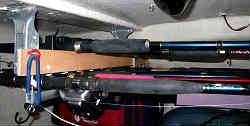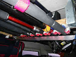 キャビン内ロッド保管:キャビン内に竿置きを作りました。写真右は竿のバッド(柄)の部分でここは角棒を上下に渡し、モップを下げて固定するポールキーパーという金具を取り付けワンタッチ固定をしています。左側の先端の方は昔使用していた車のガラスに吸盤で貼り付ける竿を挟むアイテムです。 | ![]() |