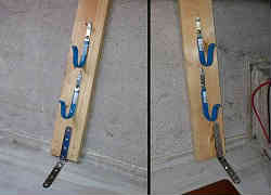 キャビン内長尺物置き用フック: すっかり荷物入れになったキャビン内ですが、やはり整理整頓をしておかないと気持ちが悪いです。後部オーニングやシート・サイドカーテン等長尺物が3つあります。そこでそれらを収納すべくフックを付けてみました。ハルには出来るだけ穴を空けたくないので、板を縦に置きステンレスの板を少し広げて板にネジ留めし、下は船底のカンコ(荷物入れ)の内側からネジを留めています。板の上部はそのままです。よって外部へは穴は空いていません。縦の板に大きめのフックを付けてみました。写真は左右別々に撮り合わせていますので不自然ですが、左がバウ側で右がスターン側です。 | ![]() |
