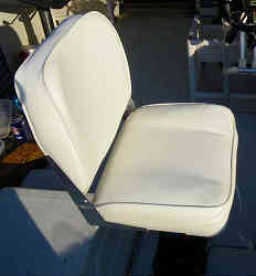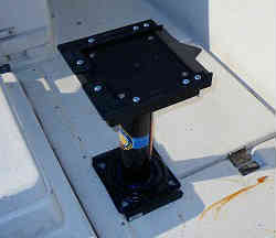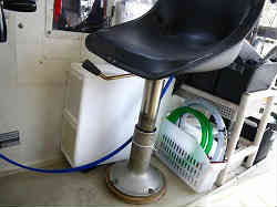 釣行用シート:運転席内には運転者と同乗者の2個のシートがありますが、釣行用にとイケスの左右に設置しました。シート用支柱台座Lサイズ(高さ44cm)の底には錆びない工業用強化プラスチック?みたいなものを噛ませて、デッキに固定しています。上はリリースベースを取り付け、その上にワンタッチで脱着できるコンパクトシート(白)と回転盤が載ります。シートは少しでも痛まないようにと普段キャビン内に入れておきます。現在では青いアップグレードなシートに変えています。 | ![]() |