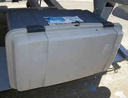 船台ボックス:船台の上(船の下)に板を置いてプラスチックの大きなボックスを設置しました。中には水道ホース・電気の延長ドラム・コード、高圧洗浄機が入れてあります。もちろん南京錠で施錠しています。以前は右側写真ですが、蓋が上に当たるので90度寝かして手前から出せるようにしました。現在では使用していません | ![]() |