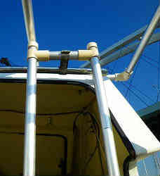 サブ(後方)オーニング:後部支柱後方のサイドレールにアルミの支柱を立てます。一番後方ではなく少し(50cm程)前方にしてあります。それには2つの理由があります。1つはスパンカー展開する時に邪魔になると、もう一つは後方へ斜めの補強パイプを立てるためです。写真の通りイレクターで組んでU字ボルトとパイプ用クランプ金具(パイプを挟んで留める金具)で固定しました。 | ![]() |