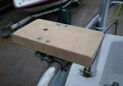 サブ竿掛け座板: 自身の2本目の竿を出すのにスターン側のパイプレールに人工板をパイプ用クランプ金具を取り付けて、平面の板状の物を設置しています。ここに上記竿受けの穴をあけて差し込み竿を固定します。左右両方(第2ゲスト用)に固定しています。 | ![]() |