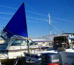 スパンカー全体:スパンカーはワイズギヤーの三角巻き取り式を購入しました。収納する時はロープを引っ張り帆を支柱に巻き取っていきます。展開する時はその逆で広げることができます。 | ![]() |