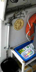 ゲスト側物入れ兼足置き台: コクピット内の助手席シートは少し背が高く脚が宙ぶらりになります。そこで以前作った箱を利用します。うまくぴったりに収まりました。箱は移動しないようにと前のワゴンとひもで固定しています。この中には仕掛け類を入れておけます。また壁との隙間の横には2段のカゴを設置し、カゴと足置き木箱の間にはビルジポンプ(ホース付き)を入れています。現在では撤去しています | ![]() |