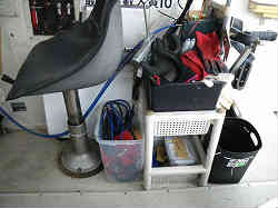 クーラーボックス掛け: クーラーボックスは通常2個持っていきます。割と嵩張って邪魔になりますので、普段使わないエンジンカバーの上にゴムバンドで固定して置きます。カバーの下部に穴をあけステンレス製のアイフックを取り付けています。もし3人目以上のゲストが居る場合はエンジンカバーは釣り座になりますので、クーラーはもっと後ろの方に追いやります。 | ![]() |