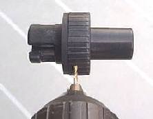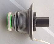 ジョイクラフト社空気注入口(ボート側)&ホース先ジョイント: 左はジョイクラフト社のボート側にある空気注入口です。中央の緑のボタンの下にコイルバネがあり、その下には緑のバルブ(弁)があります。空気注入口の下に写っているのは蓋です。出っ張りがないというのもJOYの特徴です。右はポンプホースの先にある注入ジョイントです。この注入ジョイントは切り欠きがついており、1/4回転ねじ込めるために注入中スポッと抜けません。 | ![]() |