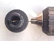 ホース先ジョイントの穴あけ:右写真のジョイントは右側にホースが付いており(はずした状態)、左側は注入口に入れる口です。中央に膨らんだ部分と同じ径のゴム板があります。このゴム板と膨らんだ部分の境目(ここから右へ1mmほどの隔壁となっている)からホース側へ2mmの所に2mm径のドリル刃で穴をあけます(ちょうど隔壁の右側に沿うように)。この場合ピアノ線を用意している方はほぼ中央を貫通させて反対側まで穴をあけます(これが結構難しいですのでネジがお勧め)。木ネジの方は片側だけで結構ですができるだけ中央に向かって穴をあけて下さい。。左写真はドリルの刃を入れた所。 しもり玉の穴あけ: しもり玉の穴が小さい場合は同じく2mmの穴をあけておいて下さい。 | ![]() |