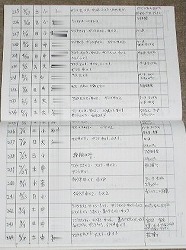 釣果記録: こちらは簡単に「年月日」「曜日」「潮」「出港場所」「簡単な釣果」「その他特筆すべき事」などを表にして書き込んでいます。その年や季節等による釣果などがデータベース化される事になります。例えばシーズン初めはどこが一番お土産ができるかなとか?、大アジはいつごろから釣れ出したか?とか、呑ませの餌となる小アジは日本海ではいつ頃からいつ頃まで釣れたかなとか?。タチウオはいつからいつまで釣れたか?とか。 同じ魚でも昨年と一昨年とはどう違ったとか眺めているだけでも次の釣行目標が立てやすいのです。 私のノートには’96年〜約300釣行の記録があります。 | ![]() |