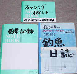 釣果日誌: 右のノートは上記にあるように釣行記録のメモです。釣れた時間帯や方法等詳しいほど良いと思います。人は必ず記憶を忘れますので、出来る限り帰宅してすぐにメモる方が良いと思われます。出港場所やポイントはもちろん航跡ルート等もあれば良いです。当日の潮の流れ時刻やポイント(あるいは底の状態の感覚)なども書き込んでおきます。あとで読み返すと思い出すことが出来やすいのです。 | ![]() |