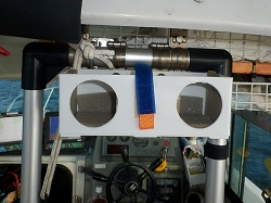 固定方法は、百均のケースにスピーカー部の所に穴を2つ空け、マジックベルトで固定出来るようにしました。右側は運転席前のコクピット用で、左はデッキ用です。ポイントへは1時間ほどありますので前に、釣りの時はデッキ用に入れておきます。 |