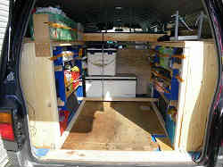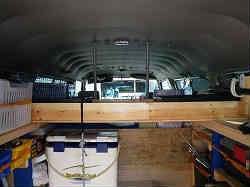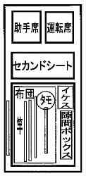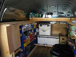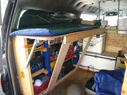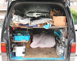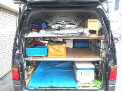 | トレーラでなかった従来は下記の通りだが、現在では荷物が大幅に減ったので、棚を2段にしてある。上段は私の就寝ベット・竿置き・仕掛け箱・コンロ等が置いてある。下段は相方のベット(布団をたたんである)とその他荷物(下記参照)を置いてある。 | ![]() |