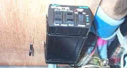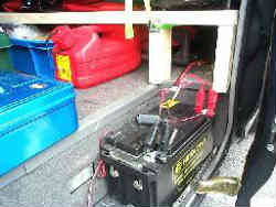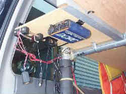 左側インバータ: 車載後方真ん中の段の上の左側のコンパネに2個目のインバータを固定しています。こちらは下記に紹介してある、車載用のバッテリーとは違うバッテリーより取っており、エンジンを止めたいときや容量の少ない電動品に使用します。インバータの左には分岐端子が見えており、これも同じバッテリーから電源を取っています。こちらは主に空気電動ポンプのワニグリップをはさんでいます。12V仕様でシガライタ−の受けも見えています。 | ![]() |
