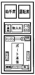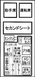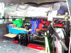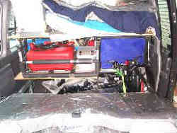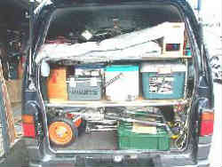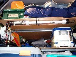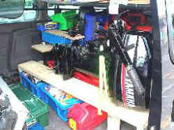![]() 車内下段/ セカンドシート下:このシートはベンチシートで結構スペース的に余裕がある。折り畳むと運転席側に立てることが可能で、下には工具箱・道具箱(ジャッキー・牽引ロープ・ブースター等)・カーナビ・CDチェンジャーなどが置いてある。 荷物室前部:ステップには車用とは別にシームレス(液漏れナシ)の65A/hのバッテリ−を置いてある。その横に太いツーバイフォーの板を敷き上にはエンジンを載せてある。奥には洗艇キットを箱に入れておいてある。 荷物室後部:ボート本体をアルミで組んだ枠の中に入れてある(従来からの袋に包むという考えはしていない)。この枠には台車がついてあり、ラクラク移動ができる。手前には前輪ドーリーと物入れ箱(コンロ・ランタン・鍋・ガス・割り箸等がある。 | ![]() |