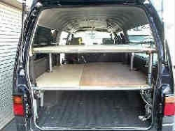 | 従来と違う工夫点は、重たいパイプですが、やはり急ブレー時キなど前後に動くことがありました。そこでそれを防止するために、短いパイプをタイヤハウスの前後にかますことで、前後左右に動かないように出来ました。底にはゴムカバーをかぶせてキズ防止にして斜めに動かないように固定しています。車内幅もギリギリ一杯の1.5mとなっております。 | ![]() |