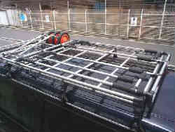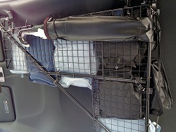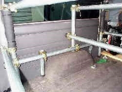 後部座席の後ろの荷物室は、工事現場の足場を組むパイプと直交クランプを組み合わして枠を作ります。たてのパイプ6本・横のパイプ6本・前後のパイプ2本で出来ています。従来よりも枠を一杯にとっているため約2割ほど広くなりました。そして色々な改良点があります。 パイプは結構安く、ホームセンターキッコリーで4m800円ぐらいで売られています。直交クランプも1個180円ぐらいであります。他のホームセンターなどではこの数倍の値段で売られているところがありますので注意して下さい。 | ![]() |