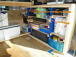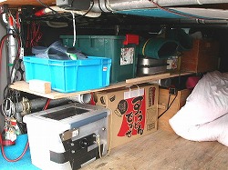 | 1/3程度の幅に小さな棚を付けてあります。棚の上にはビニール袋、ステンレス予備タンク・クレーン小道具・スリッパ・ブーツ等です。下には後輪ドーリー・GPS魚探等が置いてあります。また上写真右側はホースやゴム・ロープ・電灯等が小さな箱に入れてあります。 | ![]() |