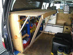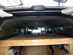 そして両サイドのチェストボックス?の台を利用して左右に角棒を取り付け補強したコンパネを敷きます。前後に3枚分です。固定式ではないので例えば自転車や家具・家電を運ぶときは外して置くことができます。また一番手前の板には手前に落ちないように板を取り付け段差をつけています。上は少し狭いですが、まあ私一人なら手足を伸ばして寝ることができます。普段は色々な荷物を置くことができます。ようやくこれで満足で終了かな?。材木類はあり合わせの残った板も使っていますので結構安く仕上がっています。 | ![]() |