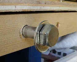![]() 右写真が通常の状態で、ベットを作るときは正面にある左右の橋渡ししている板を左の突きだしているボルトに切り欠き部をはめます。ボルトは12ミリ径の太さを使用しており、左の台の部分は角材なので貫通させても問題ありません。ボルトは裏でナイロンナットで留めており、出っ張らしたり奥に引っ込めたりとできます。切り欠きはボルトの太さの分だけ切り込みを入れてあり、はめたときに左の台と同じ高さ(面)になる位置にしています。 | ![]() |