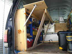 今回の改造の構想は底に薄い収納ボックスを作ること。そして上にもベットを兼ねた棚を作ることです。 底の板を外してツーバイフォーの材木を左右に這わし完全固定します。そしてその上の蓋としてコンパネを切り蝶番で固定して左右に開くようにしました。もちろん下は入れる物の寸法に合わせています。右写真は完成したところです。 | ![]() |