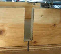 ![]() はめた後は当然力がはいりませんので、斜めに突っかい棒として板を2本はめます。橋渡しの板はコの字になっており、その角へ引っかかります。突っかい棒の板は固定しておらず斜めにはめているだけで二本まとめて端へ収納させます。橋渡しのコの字型板は寝具にしたとき若干長さが短いので、手前にもうひとつ蝶番で固定した板を付けこれもアルミ角棒を斜めに固定することで留めています。これで延長された訳です。右写真の左端はその延長分の板を折り畳んでいる状態です。アルミ角棒はボルトで軽く固定されており使わないときは下に下がった状態になっています(少しだけ見えています)。 | ![]() |