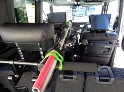 | 便利グッズの中にも紹介しているワンピースの竿を積載出来る便利な「ヘッドレストバー」なる商品(モノタロウで1個1700円で購入)です。助手席側の前後シートのヘッドレストに填めて固定が出来、運転席との間に竿が水平状態で載せられます。思ったよりも便利です。 | ![]() |