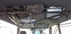 | タントカスタムは収納場所が少なく、思案したあげく天井部に棚を設けることを思いつきました。色々と試行錯誤を果たして製作した結果、まあまあ満足のいく棚になりました。助手席と後席左右の計三箇所のアシストグリップを使い、水道用のパイプ用クランプを使い、スペーシアのパイプを挟み、底の部分はダイソーの金網を結束バンドで留めました。その上には硬い箱ならガタガタ音が鳴るのが予測されたので、柔らかい平べったい箱状のバッグ(ダイソー)を収納しました。アシストグリップよりも少し上部にあるので乗り込むときに意外と窮屈では無いです。 | ![]() |