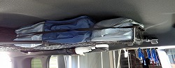 ![]() 車内上段/ 荷物室内3段目の棚: 敷き布団とシェラフそれに冬季は毛布を敷いてある。枕も用意している。そしてその上に汚れ防止のためシートを敷き、竿やタモ・旗等の色々な長尺物を置いている。 釣果写真撮影用のマス目シートは窓の所に置いてある。 布団の横にはイケス(背丈が高いためここにしか置けない)と隙間ボックス(後輪ドーリーと空気ポンプ類)を置いてある。 | ![]() |