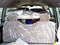セカンドシート側から見た写真です。置いてあるグッズを紹介しますと、 下:布団1人分・いけす・前輪ドーリー・魚用クーラー・人間用クーラー・餌台(箱)×2 中:ゴージャス回転いす×2・ガソリンタンク23リットル・予備ガソリンタンク5リットル・メイン竿受け・セカンド竿受け・GPS付き魚探台兼物入れ・カンコ用クーラー・ブーツケース・アンカーセット・RVボックス・小物入れ×2 上:布団1人分・竿×3・タモ×2・救命胴衣×2・コンプレッサー・ブロアーポンプ・洗艇キット・動滑車+ロープ・食器入れ 釣行のたびにエンジンはセカンドシートの足下に、ボートはカートップしています。 見ての通りアリの這い出る隙間もありません。 | ![]() |