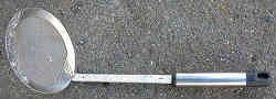 アクや汚れ:古いオモリを溶かした場合、酸化したアクやゴミ等が入っています。それは溶けないので取っ手付きザルですくいます。純正の鉛はきれいにピカピカ光り液体になります。右はすくったアク等。 | ![]() |