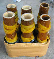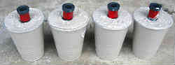 セメントの流し込み: 筒状のパイプは大きさ(直径)から割り出し、1個150gになるようにと(長さ6cm程度)、挿入する深さがわかりやすくするように赤のビニールテープを巻いています。 セメントを規定の水を入れこねた後、紙コップに入れトントンと上面を水平にしパイプを規定の深さまで差し込む。あとは2〜3日乾くのを待つ。四角い箱に4本並べることも考えたが、セメントの量が多い方がと単独の方が熱を持たない(早く冷える?)だろうと別々に型を作ることにした。 | ![]() |