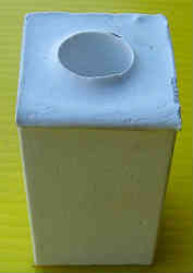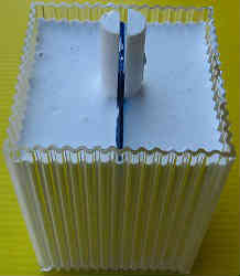 型2案No2:上記製作した半円柱形の物を真ん中に仕切りがある容器に入れ石膏を流し込みます。見た感じちょうどチョークに似ていますね。生乾きで感じていますが、果たして型から抜けるのかどうか?。 結果→失敗作となった。半円柱状の物が取れなくなってしまい、これ以上進めなくなった。結局テーパー状の円柱を型にとってあとで、チップソー等で切断する方がはるかに簡単であった。 | ![]() |