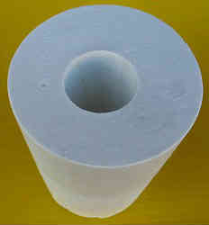 型1案:上記セメント製作でも使ったエンビの水道部品を使用します。適当な型に入れ石膏を流し込みます。ケーキ部品と同じようなテーパー状(わずか)ですが、やはり抜き取りにくい(プライヤーで抜かないと駄目なぐらい固かった)。実際に鉛を注いで抜けない場合は、チップソー等で半分に切断して合わせてから注ぎ込むというのも良いかも?。結果→テーパー状が強くないので縦に半分チップソーにて切断しました。輪ゴムで留めて鉛を流し込みました。↓ | ![]() |