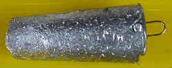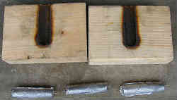 アクシデント3: 竹筒はあきらめてステンレスパイプを短く(約7.5cm)切ってその中に流し込もうとしました。1回目はスムーズに固まりトントンと叩けばスルッと落ちてきます(あらかじめCRC−556を振っている)。2回目はどうも様子がおかしいのです。うまく落ちてきませんし、無理にすると、半分ちぎれた状態になります。よく考えてみると、2回目は熱を持っているので、鉛の冷え方(固まり方)が遅いのです。よって複数本の型を用意し水等で冷やしてから次の製作に入らないといけないみたいです。もう少し実験が必要のようです。型はコンクリートブロックの代わりにアルミのブロック2個に穴を開ける方法もあるが高く付く?。→断念した。 | ![]() |