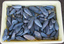 上記結果:少し完全に乾ききっていなかったので、溶けた鉛を入れたら吹きこぼれてきた。よってそのためか表面がザラザラしている。しかも太いため短くしたつもりであったが、かなり重くなっている(250g)。しかし簡単に型からははずれた。太いオモリは潮の影響があると考えられるので、今後より細い上記水道用のエンビパイプの棒状型で進める。 | ![]() |