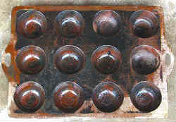 たこ焼き型: 1個315円の商品で、たこ焼きを家庭で作る物である。新しい物は周囲縁に段差があったので削った。右写真が削った後の物である。2枚利用して球形のおもりの作り方は2種類有り迷ったが、縦一列穴3個1セットに切り分け、とりあえず合わせが縦型(外すときは左右に剥がす)を実験で作った。2枚を合わせ、上部にあたる一部分に穴をあけ(削る)、クランプで固定し溶けた鉛を流し込んだ。 結果重さが2倍の80号相当になったので、合わせない半分の半球として製作した。 | ![]() |