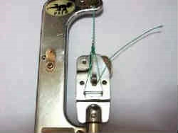 ハリ結び2: ハリ結びに糸をセットした状態です。糸はわかりやすくするためにPEライン(緑色)を使用しています。左の真ん中辺の糸止めからハリの軸の向こう側を通し、手前の下へ通して、回転板の糸止めを通して上に上げて、最後は上の糸止めに通しています。 | ![]() |