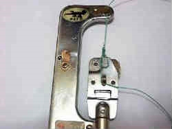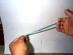 ハリ結び5: 最初に引っかけてあった(四角い針金部分)糸をはずし、上の糸をゆっくり引っ張る。そして糸の先端をワッカから抜いた状態。 | ![]() |