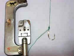 ハリ結び1: ハリ結び器にハリをセットします。この時ハリの軸がまっすぐにセットされるようにします。私はなぜ丸海津ということですが、軸が長くてまっすぐなので、巻きやすいために使用していることと、漁師さんも結構使用しているからです。右のハリは「胴突き丸海津」といって軸に平たい部分があり、より強度が出るようになってます。 | ![]() |