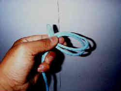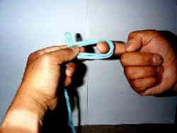 8の字結び4: 人差し指を左に回しながら、ワッカにした二重の先端を人差し指でつかもうとしている状態。 | ![]() |