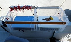 | エバ仕掛けはテッポーよりハリ数は少ないですが長さは同じ程度です。間は5mでハリス長は3.5mの10本ハリなのでおおよそ55mほどの全長です。全長はともかく枝が3.5mと非常に長いため、かなり熟練しないともつれて仕方ないと思います。そのため仕掛け箱も2個用意し幹と枝とそれぞれ別に収納しています。箱のつなぎ目の所に細長いフックを付け、それぞれの枝の親子サルカンを止めていき、枝ス糸と針左に、幹糸とツバメ板を右に収納します。親子サルカン部を留めているので、両手を離して枝スの収納や魚の取り込みが簡単にできます。疑似餌をよく見ると針本に斜めに尖った物(昔は竹で細工)が付いています。これはちょうど潜行板(ツバメ板)のように斜めに海水が当たって左右にフラフラ首を振ってアピールします。 | ![]() |
