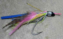 作り方は前述の通り無かったので会員さんに頂いた物(チモトの中身がわからない)を参考に真似してみました。もちろん正解がどうかはわかりませんが・・。 各種羽毛や飾り物を適当に揃えて置く。ピンクの力糸を15cmに切り輪(ここにハリスを結ぶ)にしておく(結び目が抜け防止になる)。 ハリのチモトにボンドを塗り、束ねた飾り物と輪にしたピンクの力糸をチモトに添え白くて細い力糸を巻いていく。斜めに切ったゴムホースがギリギリ入るまで巻いていく。この量なら一重でOKです。最後に巻いた糸にボンドを塗り斜めのゴムホースの向きを気をつけながら差し込んで完成です。テッポーと比較してこの部分は格段の手間が掛かります。この後はテッポーと同じでナイロン糸で10本ハリの長さ55mに仕上げていきます。 エバ仕掛けは市販品で8600円とかなりお高いです。 | ![]() |