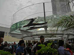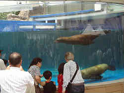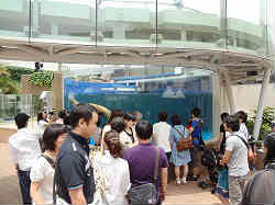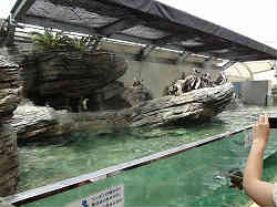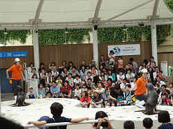 | 屋上のアシカショーです。2人のお姉さん達がアシカ君にエサをやりながら色々とショーを盛り立てて行きます。途中アシカのかぶり物(金色の大仏の顔?)が珍しいと解説していました。ショー自体は小さな規模で360度観客が回りこんでいますので、あちこちと角度を代えながらの物で小規模でした。中見もあまり大したことはしていませんでした。ここも非常に混雑していて後ろはほとんど見ることができません。 | ![]() |