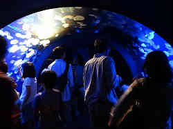 | ここはクラゲのプラネタリウム風トンネルとして作られており、短い距離ですが上部に覆うように水槽があり、泳いでいるクラゲを天空のように見上げながら奥へと歩きます。 | ![]() |