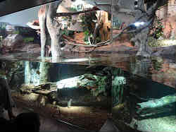ここは古代の森?をモチーフにされています。陸と水中とその中間に棲む動植物たちの住み家です。生き物よりか年月を感じる植物や光と影などの方が印象に残ります。 ここに写真はありませんが、小さなラッコの水槽の前で人だかりが出来ており覗くとラッコのエサやりショータイムでした。後ろの人は見ることさえ出来ない混雑ぶりで私はちらっと見ての素通りでした。見たときは貝もむき身で与えていましたが、そのあとで貝殻付きの物を与えていたのかもしれません。 | ![]() |
