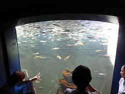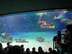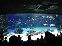 屋内展示用のメインで中央に巨大な水槽があり、エイをはじめ多くの魚たちが泳いでいます。そしてちょうどダイバーによる水中散歩?らしきものがあり、魚たちと一緒に優雅に泳いでいます。右写真の赤いのがダイバー。 | ![]() |