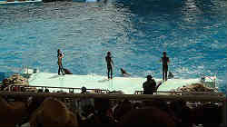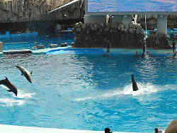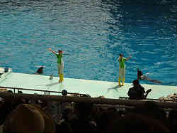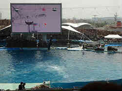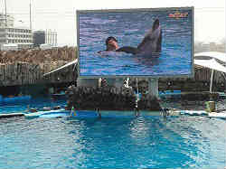 | このハイビジョンテレビは世界最大級(バレーコートより大きい)だそうで、プールの大きさは左右60m、奥行き30m、深さ12mに水量はなんと13、400トン。テレビのモニターには今やっているショーのリアルタイムな場面はもちろんの事、水中(潜っているイルカの様子)も写り、次の水面へのジャンプもリアルタイムにわかる。しかも次の間の間には必ずリプレイの映像を流しその間飽きないようにしている。またダイバーが水中でイルカに掴まりながら泳いでいるのも一望できる。 | ![]() |