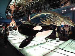 | ここは南極の鯨をメインとしています。シャチや鯨の標本があります。かなり大きな本物もあり、エスカレータの上に16m程度の物も飾っています。写真はうまく写っていないので紹介はできませんが、ここには白イルカ(ベルーガ)も居て繁殖後、赤ちゃんを育てています。光に弱いのか暗いところで観客が見えないように(観客からは暗く見える)スクリーンされた部屋に居ます。 | ![]() |
