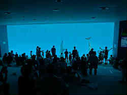 | ここは先ほどのイルカショーのプールの底にあたります。上でのショーの時(見るのはいつでも出来るが)に、下に敷いた絨毯の上に座って観覧できます。ダイバーの水中での映像もここで本物が見られます。今はショーの後なのでゆっくりとイルカが泳いでおり、避暑目的な感じで冷房の効いた部屋で見ています。 | ![]() |