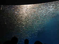 | 次に隣の棟の南館です。ここには他の魚とカメ、ペンギンが主です。右は大きな水槽(他の水族館ではこれがメイン水槽ぐらい)の中に無数のイワシの群れで、中に他の大きな肉食魚が泳いでいます)群れの様子や離れた魚たちの行動が手に取るように見られます。 | ![]() |